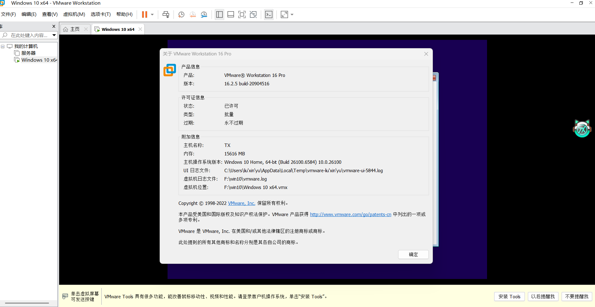 8.输入完成后,打开软件,点击帮助——关于VMware产品,出现永不过期则代表安装以及激活成功↓↓↓